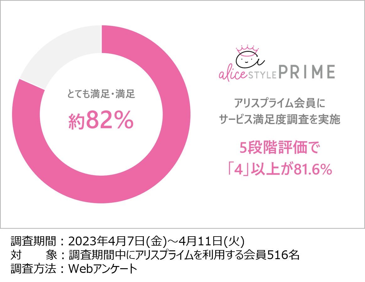 PRtimesのプレスリリースによると、Alice.style PRIME(アリスプライム)を利用した80%以上の方が『満足』または『とても満足』と回答しているそうです。