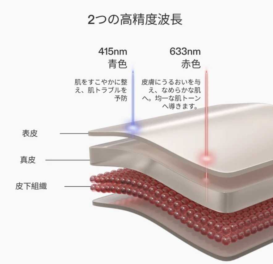 POINT 青色LED415nm+赤色LED633nmの2つの波長が同時に働くことで、繰り返すニキビや肌トラブルを根本からケア!