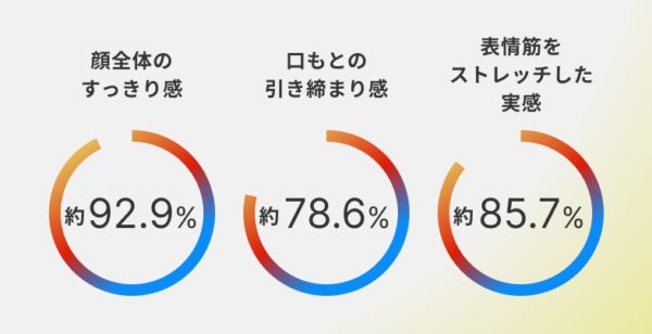 ※『表情筋研究所』調べ ※【試験条件】試験方法:半顔にオーラルリフトを1.5分間使用、残り半顔は1.5分間の間何も使用しないときの左右比較を行い、製品の肌状態への影響と体感を比較。効果実感において「1点:全く効果がなかった」~「7点:非常に実感があった」までの7段階評価で、使用前よりも使用後に効果を実感した人の割合を算出。被験者:45歳~67歳の女性14名。